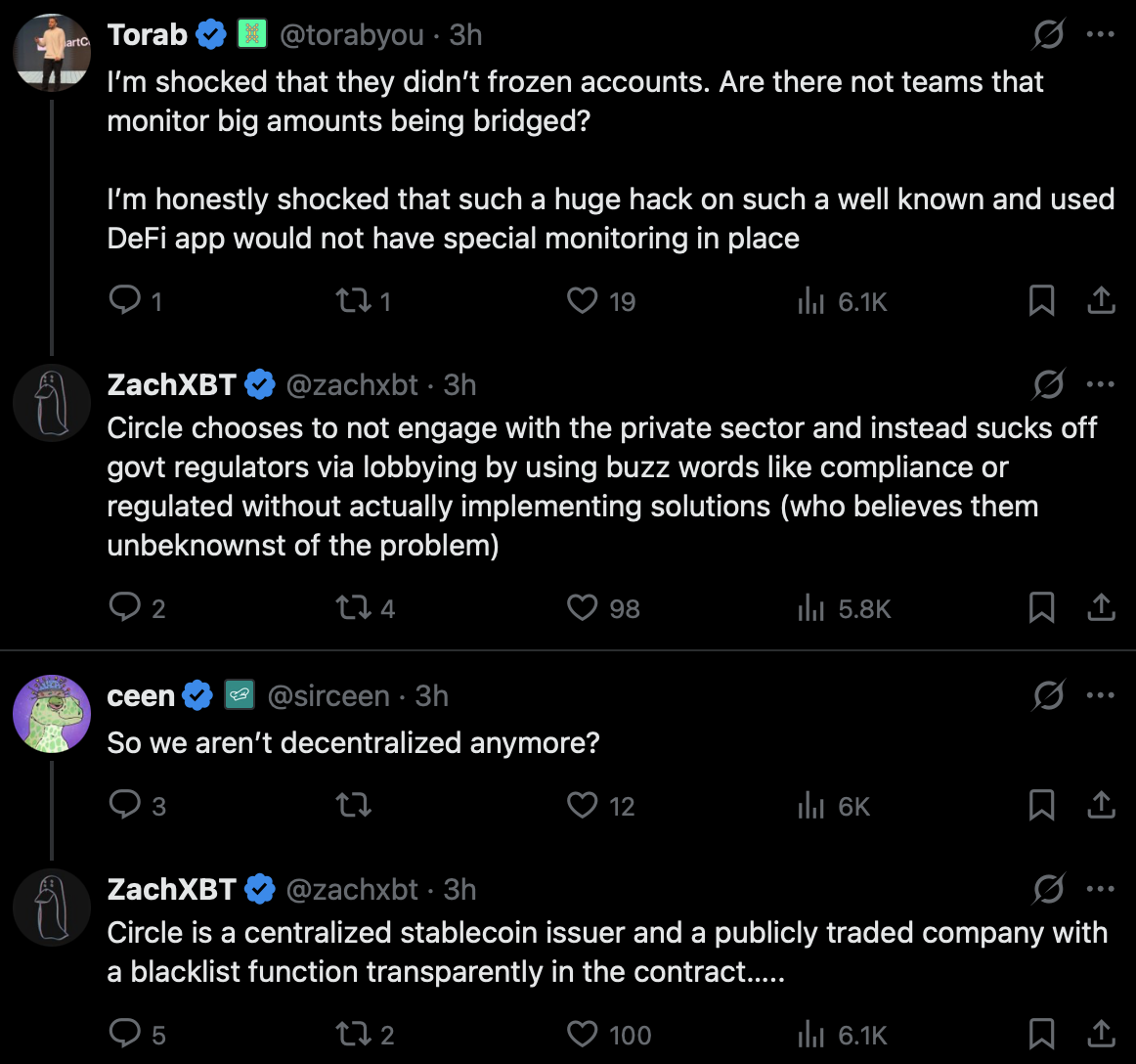 ZachXBT 很直接的說 ,Circle 在 9 位數金額規模的駭客事件中「睡著了」。